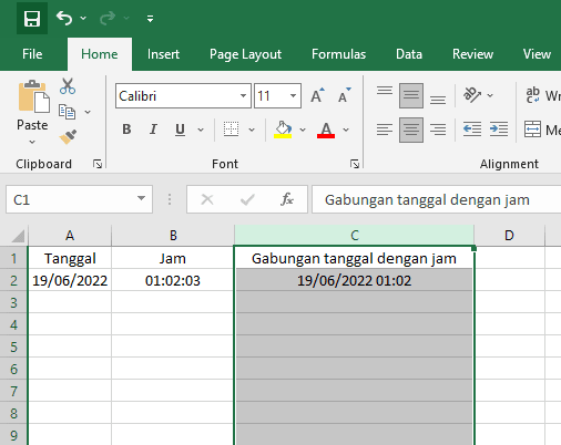 Untuk menggabungkan tanggal dan jam pada contoh excel di atas, maka masukanlah rumus di bawah ini ke dalam cell C2 :